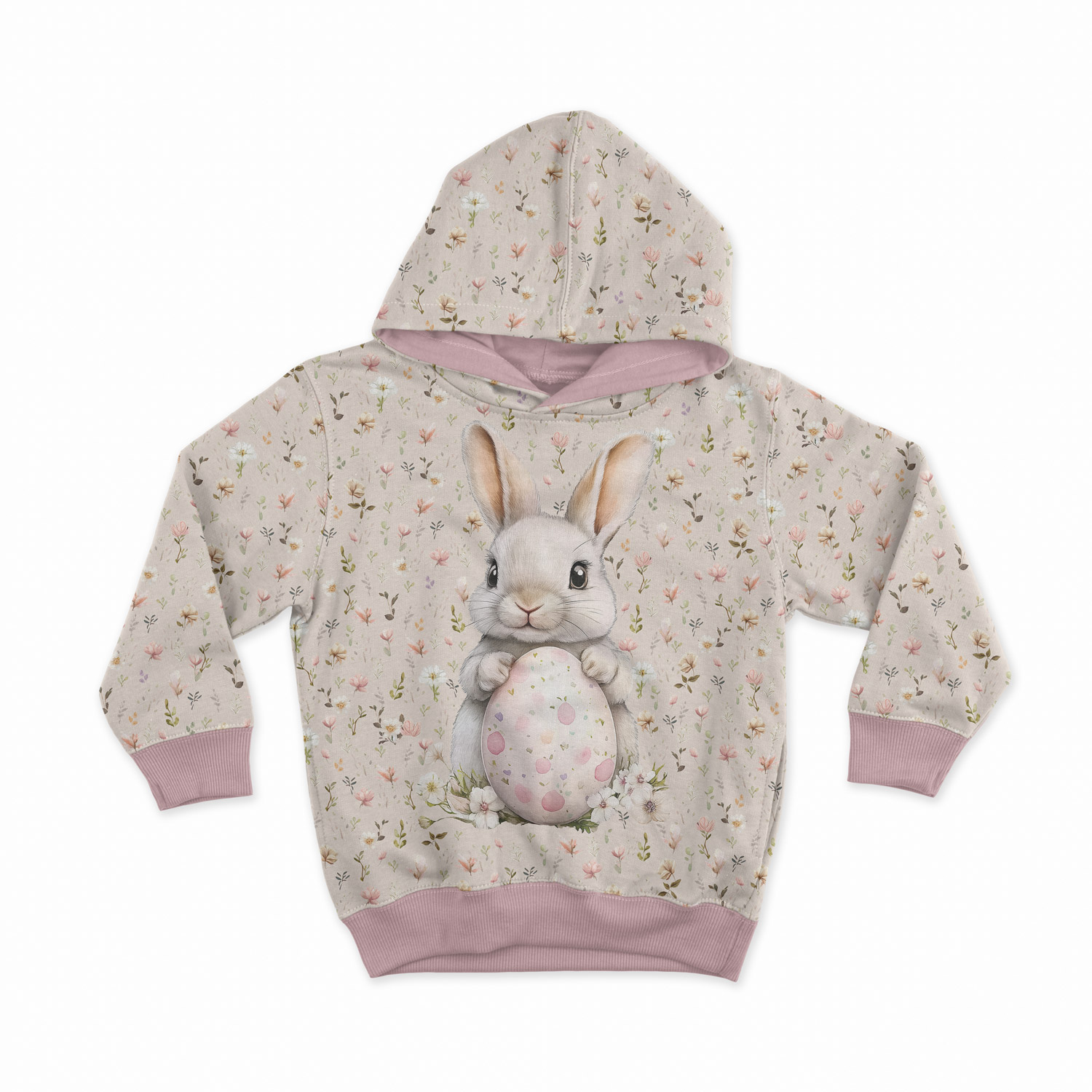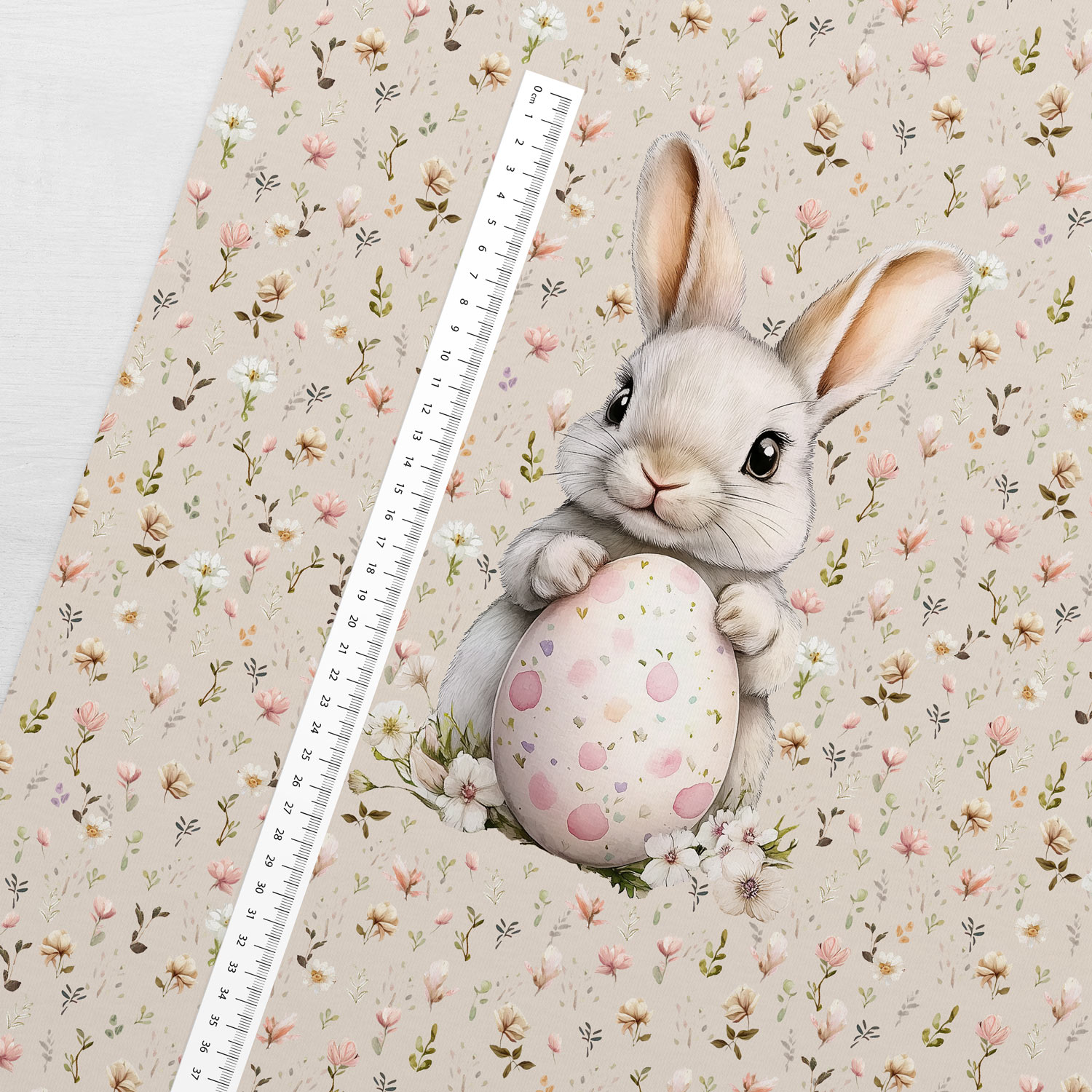 Sommersweat Panele1 French Terry Sommersweat Stoff Panel mit Hase, großem Osterei und Blumen auf Beige – Mädchen Osterhase Stoffpanel zum Nähen für Baby & Kinder – Digital – Ökotex – Osterliebe