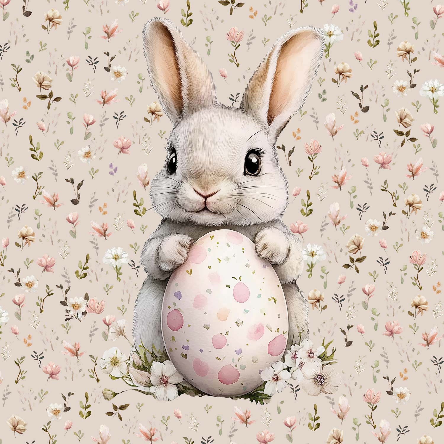 1 hochwertiges Sommersweat / Sweatstoff Panel mit herzallerliebstem Hasen Mädchen mit einem großen Osterei und Blumen. Es ist ein zuckersüßes Panel für Frühling, Ostern und Herbst – denn die dezenten Farben Grau, Braun, Beige, Rosa, Weiß und Mint wirken wunderschön im Vintage Stil und drängen sich nicht in den Vordergrund. Trotzdem ist das Motiv so hübsch, dass man es nicht übersieht.